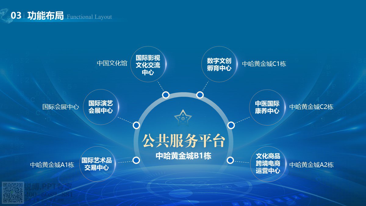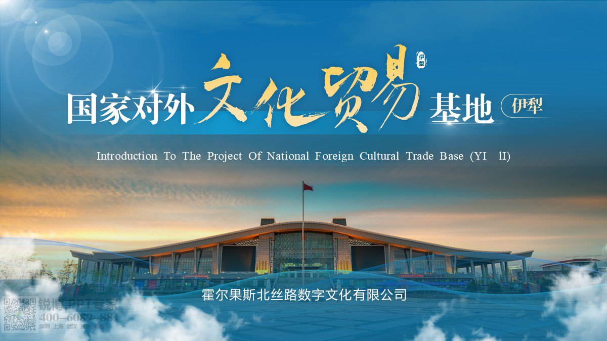 整體以藍色為主色調,營造出沉穩、專業的氛圍,契合文化貿易主題。