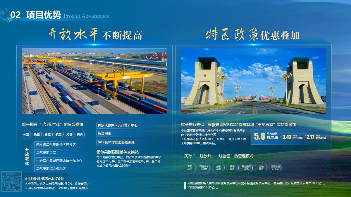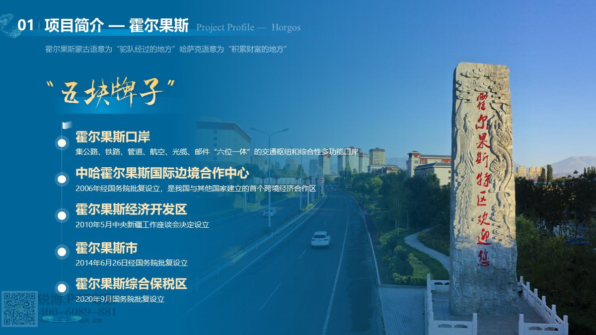 版式上采用模塊劃分,信息條理清晰。實景圖片與文字搭配,直觀展示霍爾果斯及項目場地風貌,標題用書法字體凸顯文化底蘊。