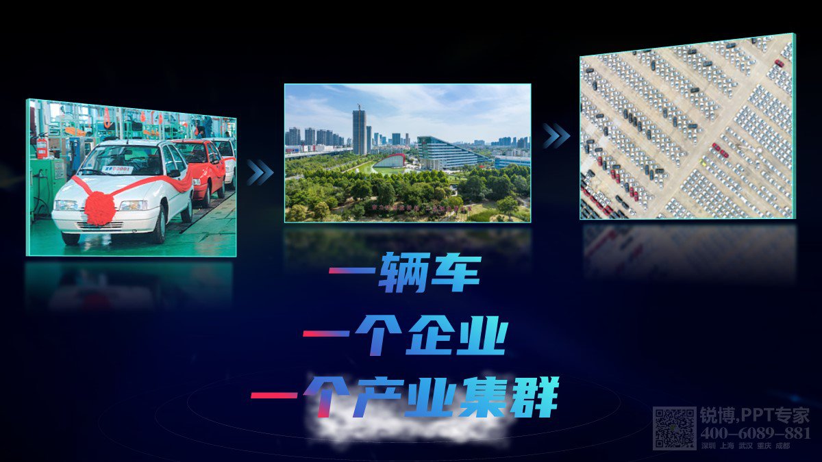 圖片直觀呈現汽車生產與城市風貌。標題字體醒目且色彩鮮明,正文簡潔,突出汽車產業的發展成果與趨勢。