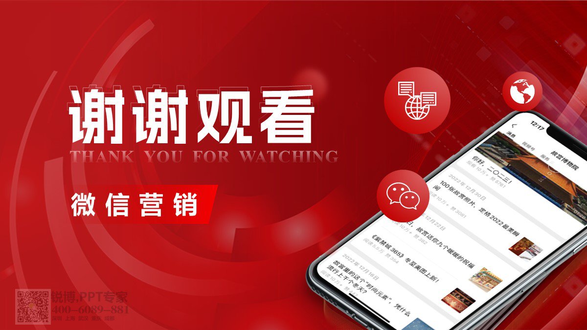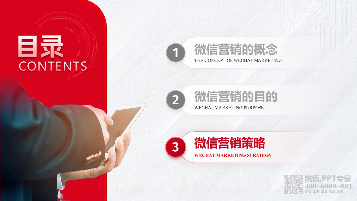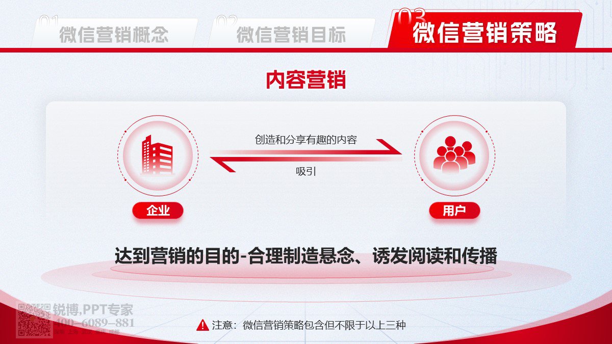 版式上,圖文并茂,通過目錄、案例、策略等模塊有序呈現內容。字體簡潔清晰,標題突出,便于觀眾快速抓取關鍵信息,整體設計利于講解微信營銷相關知識。