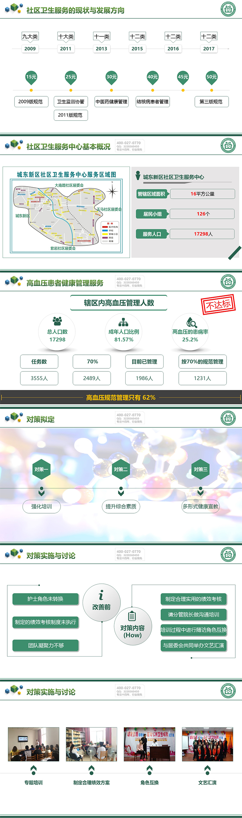 社區衛生服務(community health service,CHS)是社區建設的重要組成部分,是在政府領導、社區參與、上級衛生機構指導下,以基層衛生機構為主體,以人的健康為中心、家庭為單位、社區為范圍、需求為導向。PPT使用了溫馨的綠色,版面簡潔大方,與社區衛生服務機構的性質相呼應,體現了其為群眾服務的宗旨。