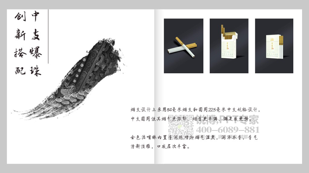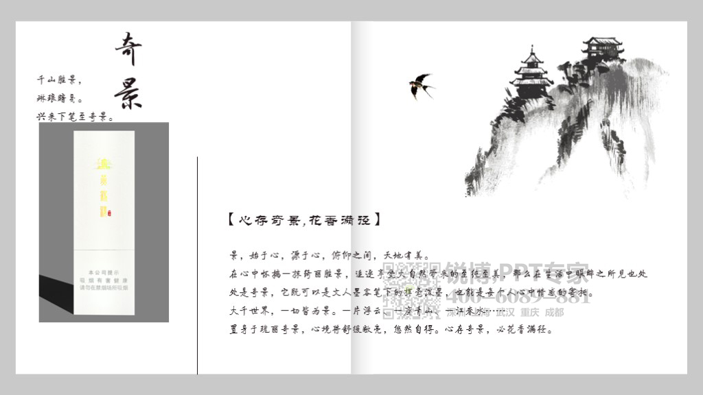 — 說(shuō)明:由于奇景的產(chǎn)品特性選用了相符的中國(guó)風(fēng),整個(gè)畫面多采用黑白灰,如同水墨一般充滿了韻味。采用書法字體配合中國(guó)風(fēng)的裝飾圖案,和產(chǎn)品的風(fēng)格一致,融合的十分完美,令人印象深刻。