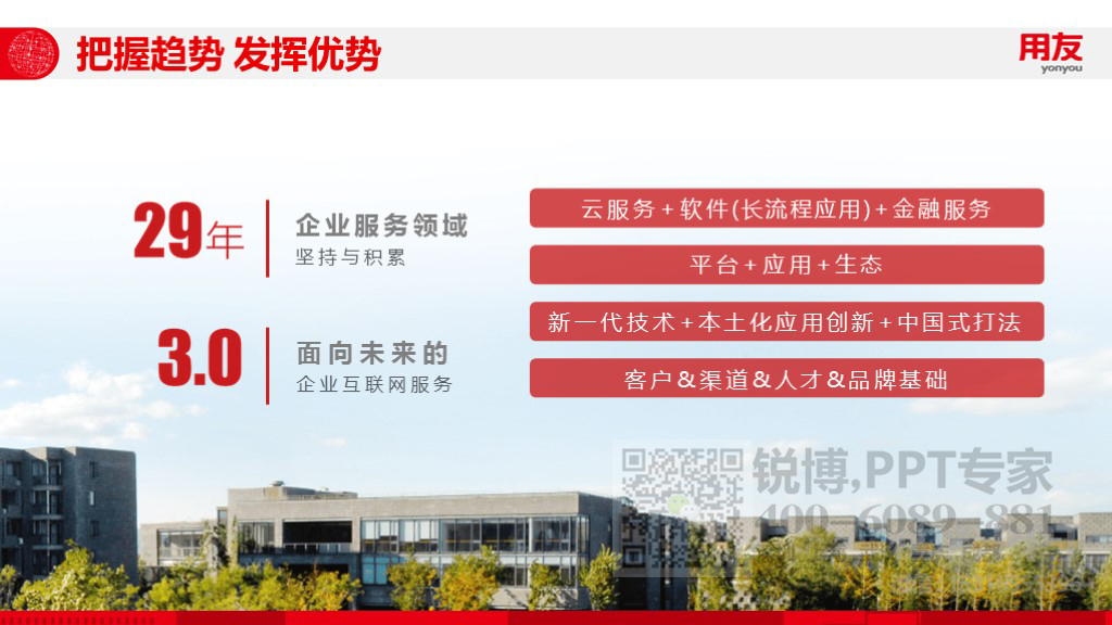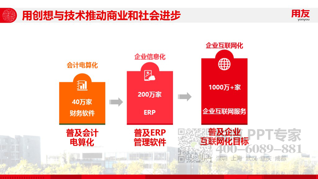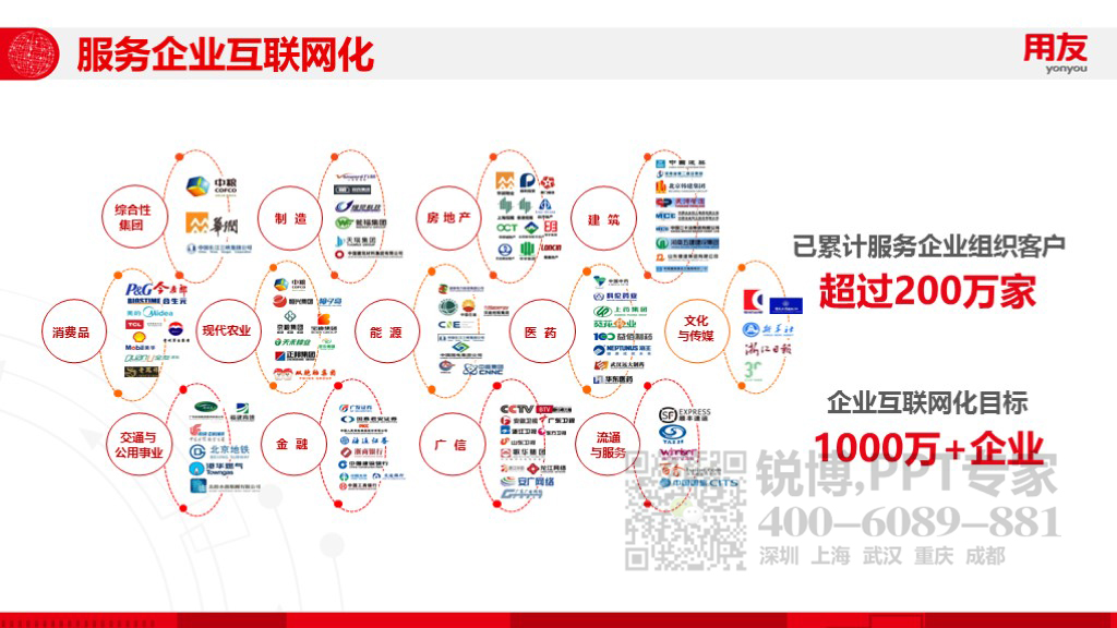 — 說明:由于用友的企業形象設計中采用的是橙紅色,為了達到統一視覺符合用戶企業文化的效果PPT最終也采用了橙紅色為主調。大量的信息在經過簡化后通過圖表化的設計手法,化繁為簡突出重點,高效的傳達信息。