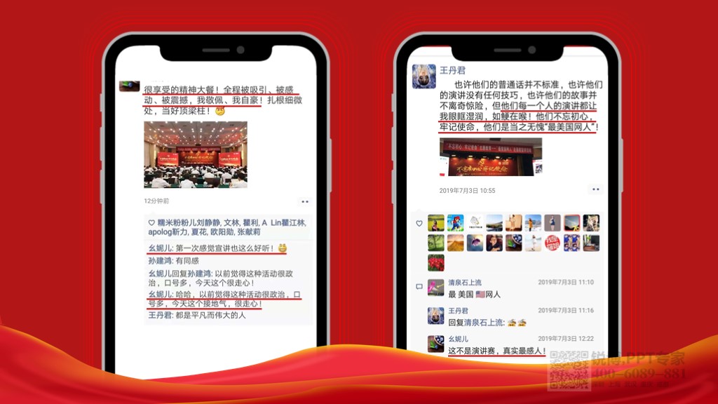 — 說明:以紅色為主色深配合淡黃或金黃色的文字,使整個的ppt具有穿透力,對視覺的影響力也最大,是最引人注目的色彩,深紅色色彩的采用規避了某些會容易讓人感覺過于跳躍的因素,清晰的結構展現了文案的邏輯性。