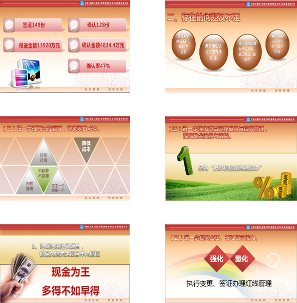 案例介紹: PPT采用紅色調、漸變色,跟該集團的報告內容比較吻合;同時,襯以時尚紅,避免畫面過于沉悶和保守;PPT的導航系統盡量做出創意,同時保證PPT的邏輯清晰和嚴謹;動畫以簡約、順暢和創意為主,不雜亂、不瑣碎。本PPT與隨后的視頻宣傳片相互補充,有助于活動目標的順利實施。