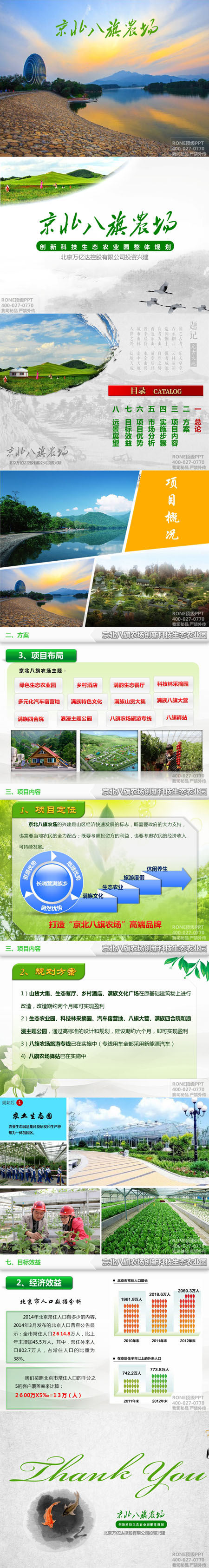 京北八旗農場主要從事果樹、蔬菜、花卉、中草藥、谷物等的種植兼酒店餐飲、旅游、科技開發,北京萬億達控股公司投資新建。銳博為其設計項目規劃PPT,整個版式重點突出了農場環境、項目布局和定位、具體的規劃方向和未來的收益情況。整個版式畫風簡潔淡雅。