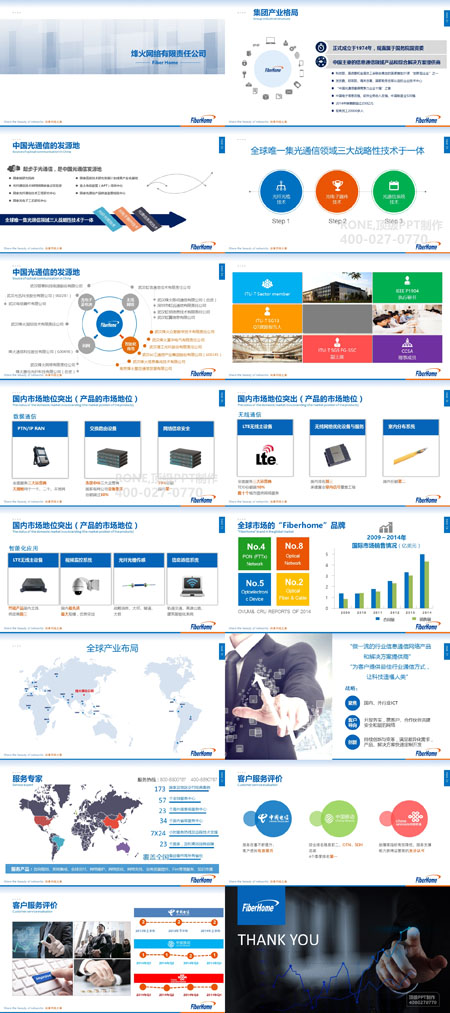 烽火網絡有限公司作為國有上市企業,又是目前國內唯一集光通信領域三大戰略技術于一體的科研與產業實體,在推動我國信息技術研究、產業發展與國家安全方面具有獨特的戰略地位。銳博根據對PPT整個結構的分析,對其行業特性的分析做出幻燈片演示方案,整體色彩以藍色為主充分體現行業屬性,及大氣的風格。