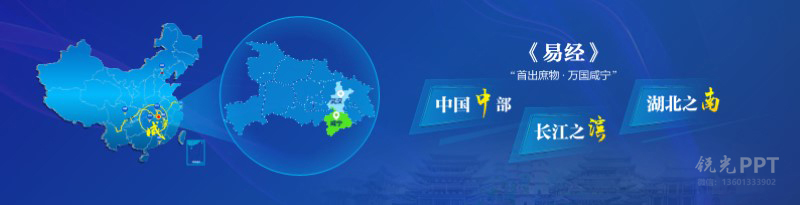PPT設(shè)計(jì),書法字體和咸寧風(fēng)景圖的搭配使用,凸顯了咸寧人杰地靈,精確地圖形繪制,更好地展現(xiàn)了咸寧的區(qū)位優(yōu)勢。