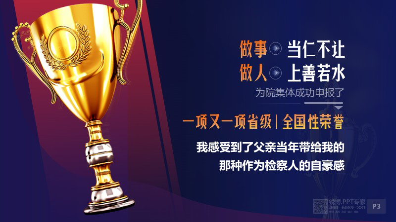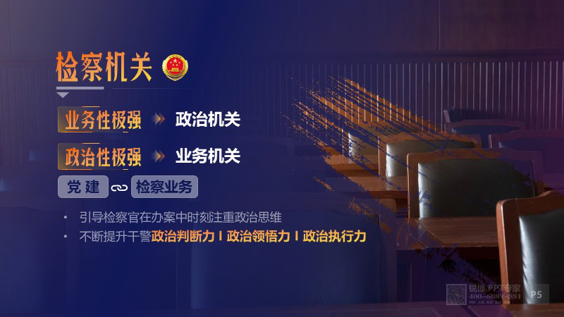 場景化圖片為輔突出檢察院莊嚴肅穆的感覺,運用文字顏色的對比和大小對比來突出核心內容,