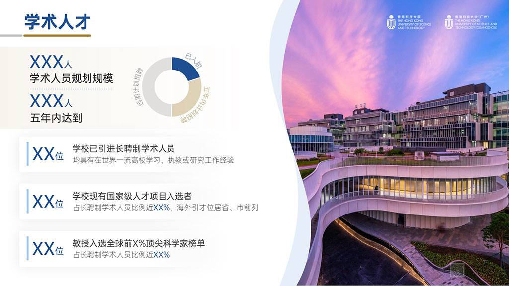 PPT整體采用藍色作為主色調,藍色代表科技感和神秘感,與香港科技大學的行業特色相呼應,傳遞出學校的創新精神和學術深度,